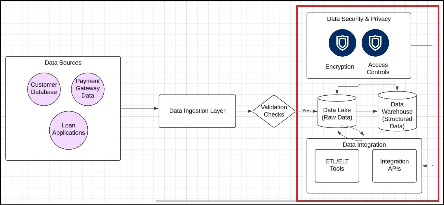 Connect these nodes to storage layers (Data Lake (Raw Data) and Data Warehouse (Structured Data)) and integration tools (ETL/ELT Tools and Integration APIs) using arrows to indicate secured data flow