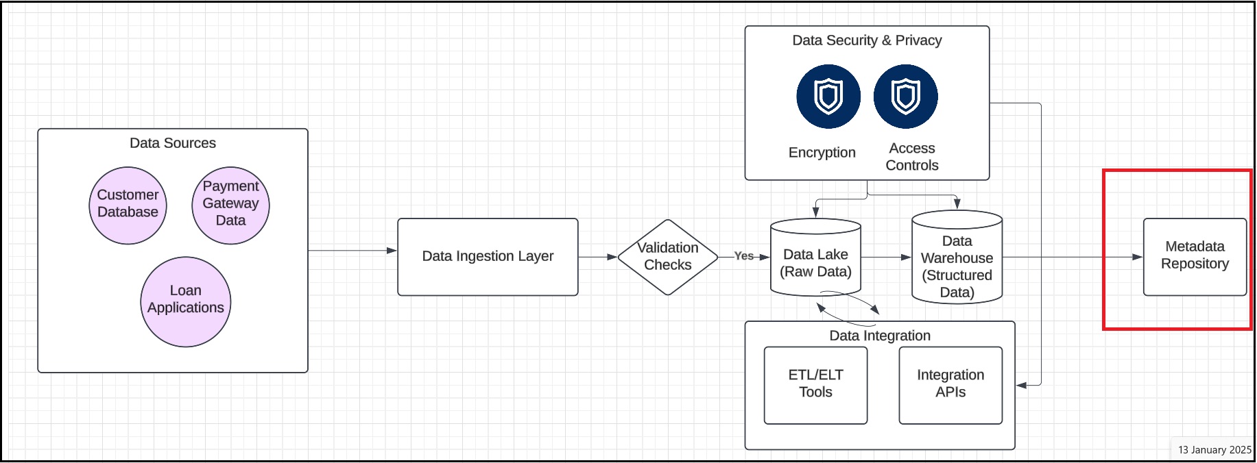 Add a rectangular node labeled Metadata Repository to represent the centralized system for storing metadata, including definitions, lineage, and usage details