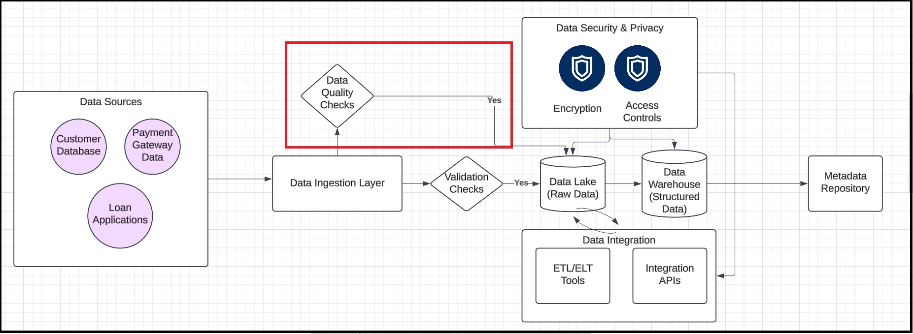This setup emphasizes how data quality is enforced during ingestion and after storage, maintaining the integrity of the consolidated data infrastructure.