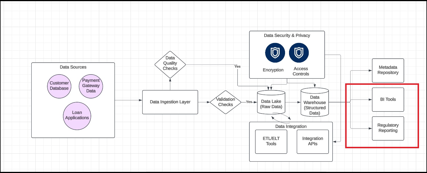 Add rectangular nodes labeled BI Tools and Regulatory Reporting to represent business intelligence analysis and compliance reporting systems